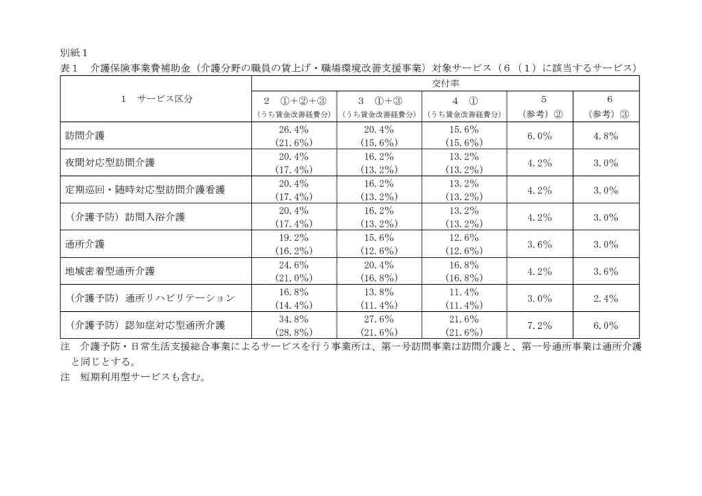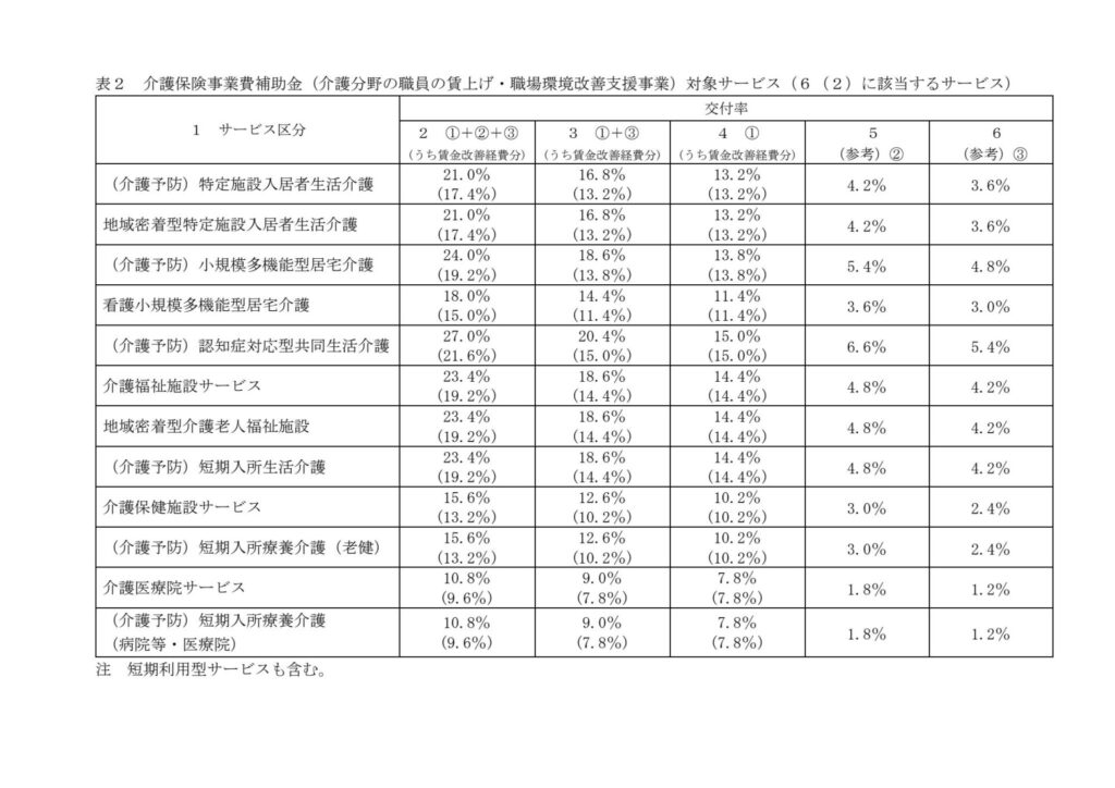 なお、要件②(生産性向上・共同化の取り組み)を満たす事業者は、交付率の表の5欄(訪問介護であれば6.0%)の交付率で計算された分の補助額を、事業所の判断によって介護職員以外の職種に配分することが認できます。