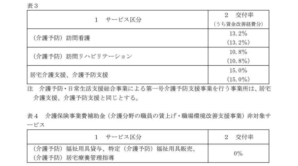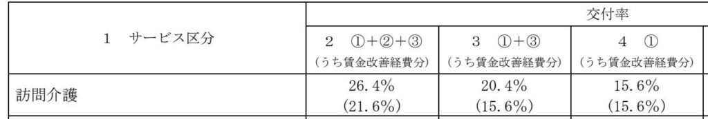 例えば訪問介護では下表のように、要件①のみを満たす場合は交付率15.6%、最大(要件①・②・③すべて満たす)で交付率26.4%となっています。